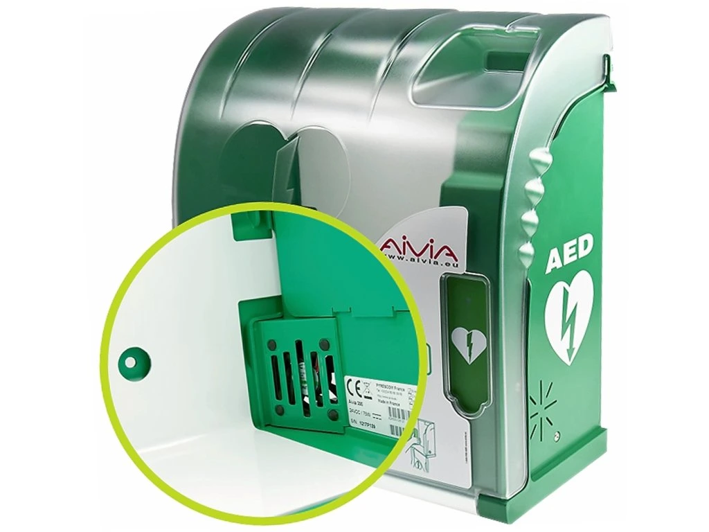 Skříňka s alarmem pro defibrilátory AED je z odolného materiálu. Alarm se spustí na 3 minuty po otevření schránky. Pro přehlednost je přední kryt průhledný. Na předním krytu je umístěn štítek, kam je možné uvést číslo pro zavolání první pomoci. Schránka není uzamykatelná kvůli bezproblémové dostupnosti AED defibrilátoru. Na zadní straně schránky jsou připravené otvory pro připevnění na zeď.